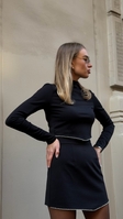 Топ із довгим рукавом і спідниця декоровані камінцями по нижньому краю. Камінці акуратно пришиті, що гарантує надійність і довговічність декору. Обидва елементи комплекту застібаються на потайну блискавку, яка не порушує цілісність дизайну.