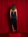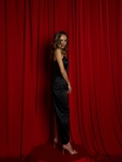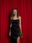Гладкий атлас із благородним блиском красиво відбиває світло та виглядає розкішно в русі. Асиметричний низ із розрізом підкреслює ноги та додає образу динаміки й спокусливості.